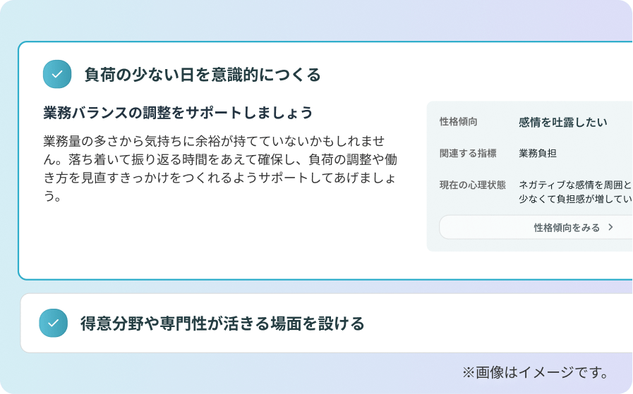 アドバイスを提示メンバーには個人の性格や心身の状態に合わせたセルフマネジメントのアドバイスを、マネージャーにはメンバーごとの最適なマネジメントガイドを提示します。
